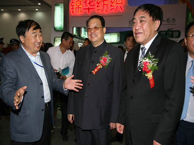 中國(guó)紡織工業(yè)聯(lián)合會(huì)原會(huì)長(zhǎng)王天凱(右一)與公司董事長(zhǎng)王力民(左一)親切交談
