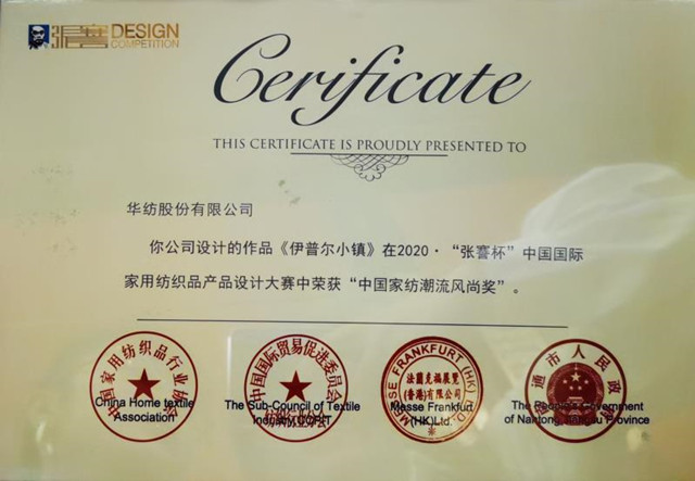 9月2日,以“潮流·生活”為主題的2020·“張謇杯”中國國際家用紡織品產(chǎn)品設(shè)計大賽頒獎盛典在江蘇南通舉行。公司工業(yè)大麻材質(zhì)的家紡作品《伊普爾小鎮(zhèn)》,榮獲“中國家紡潮流風(fēng)尚獎”。