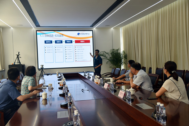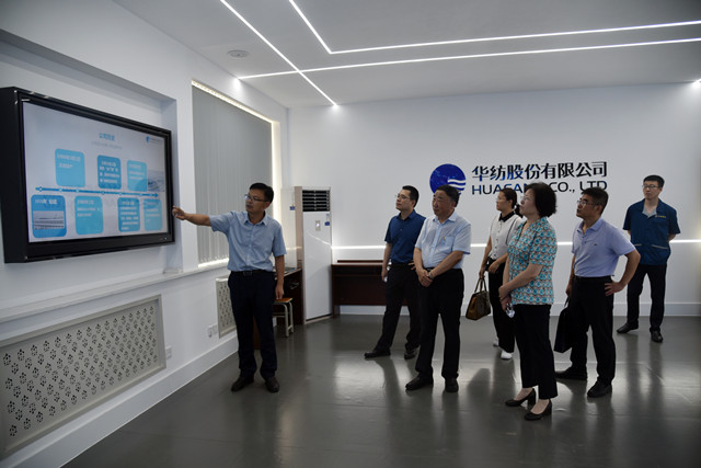 曹學(xué)軍一行先后參觀了花布車間、綜合辦公區(qū)、家紡展廳、研發(fā)創(chuàng)意中心、工程技術(shù)研究院、智云中心等部門和區(qū)域,并聽取了公司推進(jìn)智能綠色工廠建設(shè)情況的匯報(bào)。