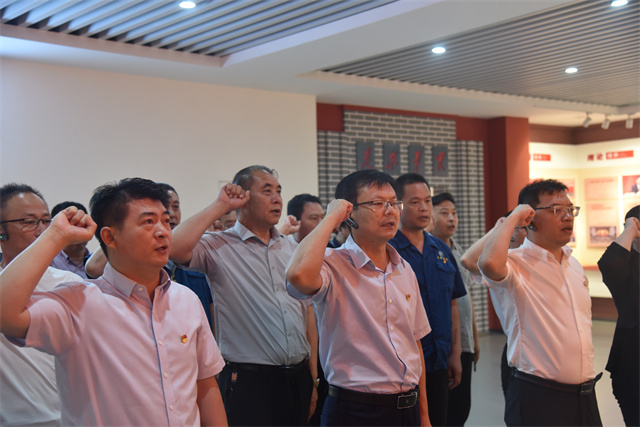 參觀最后,全體黨員在公司黨委書(shū)記、董事長(zhǎng)盛守祥的帶領(lǐng)下,舉起右拳面對(duì)黨旗,重溫了入黨誓詞。