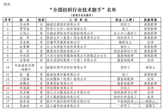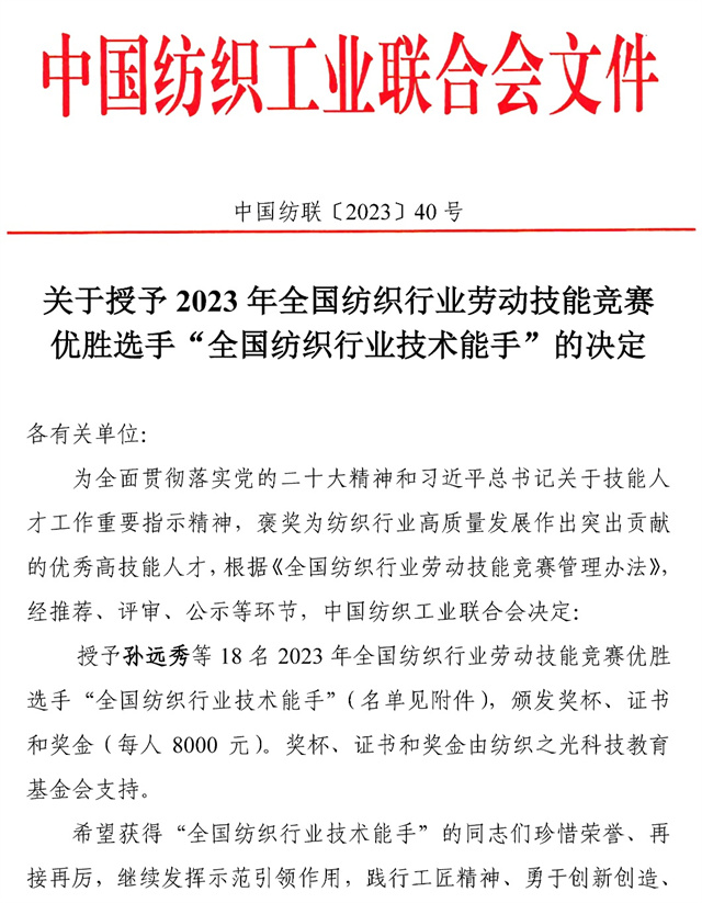 導(dǎo)讀:近日,中國紡織工業(yè)聯(lián)合會(huì)發(fā)布了授予在2023年全國紡織行業(yè)勞動(dòng)技能競(jìng)賽中取得前18名的紡織企業(yè)員工為“全國紡織行業(yè)技術(shù)能手”榮譽(yù)稱號(hào)的決定,