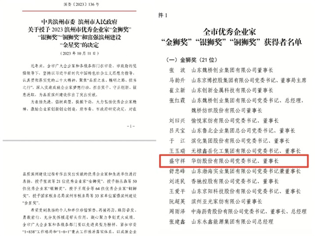 會上,對在品質(zhì)濱州建設(shè)過程中作出突出貢獻(xiàn)的優(yōu)秀企業(yè)家和先進(jìn)單位進(jìn)行了表彰頒獎,公司黨委書記、董事長盛守祥先生榮獲2023濱州市優(yōu)秀企業(yè)家“金獅獎”。