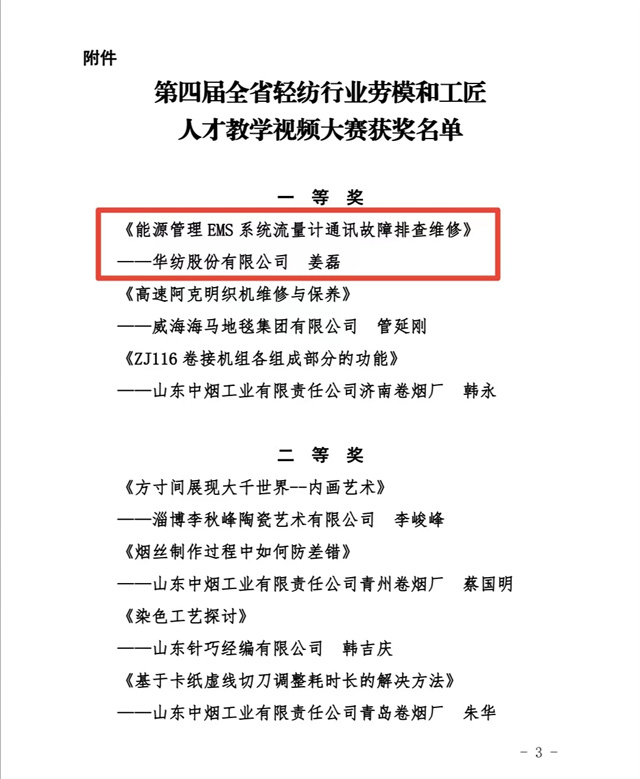 近日,山東省輕工紡織工會委員會組織開展的第四屆全省輕紡行業(yè)勞模和工匠人才教學(xué)視頻大賽評比結(jié)果揭曉,經(jīng)專家評審和網(wǎng)上公眾投票,評出一等獎3名、二等獎4名、三等獎5名、優(yōu)秀獎7名。公司電氣車間儀表技術(shù)員姜磊報送的《能源管理EMS系統(tǒng)流量計通訊故障排查維修》項目榮獲大賽一等獎。