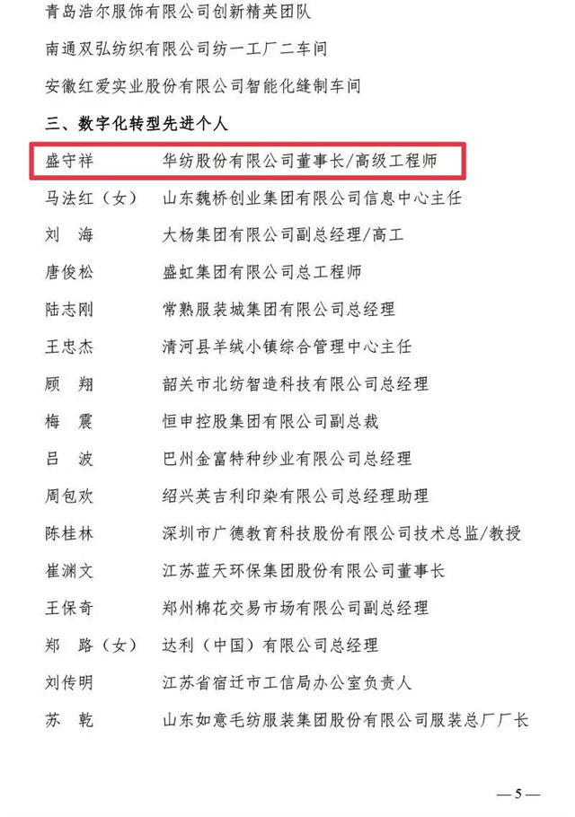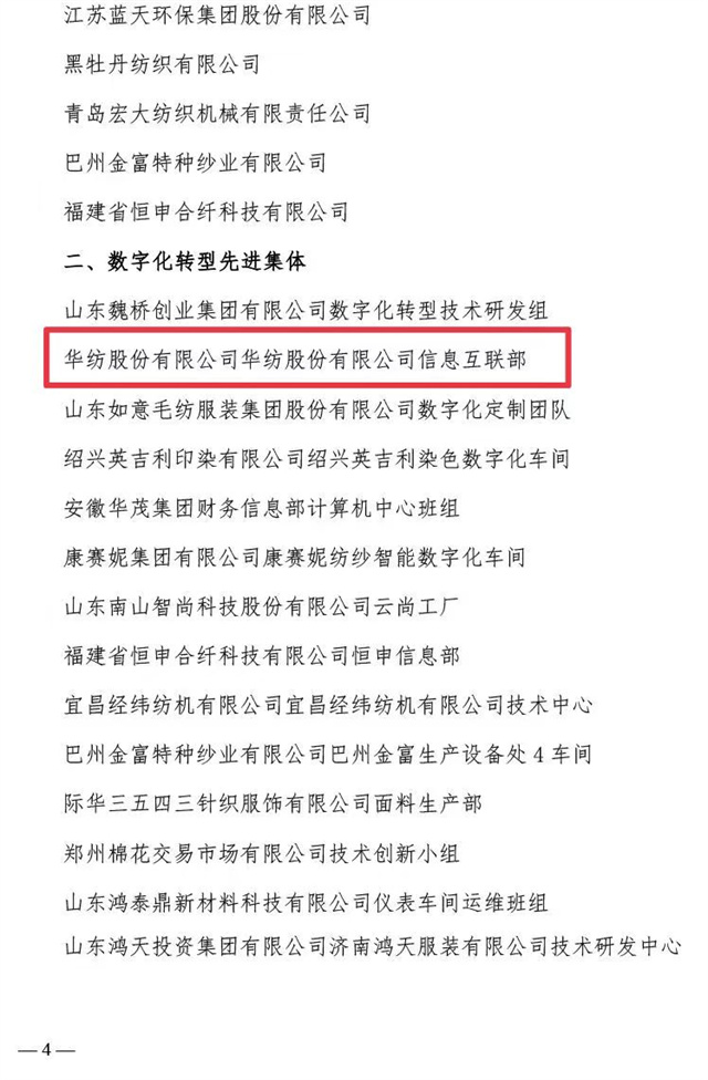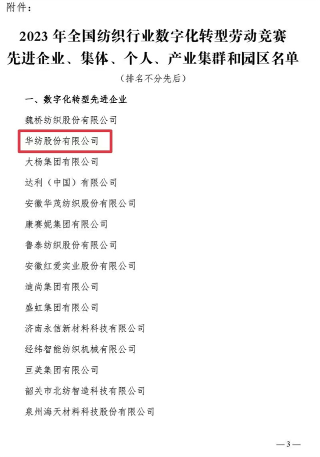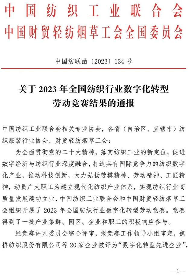 近日,中國紡織工業(yè)聯(lián)合會、中國財(cái)貿(mào)輕紡煙草工會全國委員會聯(lián)合發(fā)布了《關(guān)于2023年全國紡織行業(yè)數(shù)字化轉(zhuǎn)型勞動競賽結(jié)果的通報(bào)》,公司憑借2023年在數(shù)字化轉(zhuǎn)型方面的不斷探索與創(chuàng)新被評為“數(shù)字化轉(zhuǎn)型先進(jìn)企業(yè)”,公司信息互聯(lián)部被評為“數(shù)字化轉(zhuǎn)型先進(jìn)集體”,公司黨委書記、董事長盛守祥先生被評為“數(shù)字化轉(zhuǎn)型先進(jìn)個人”。