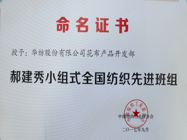 導(dǎo)讀:公司花布產(chǎn)品設(shè)計(jì)開發(fā)部榮獲郝建秀小組式全國紡織先進(jìn)班組。