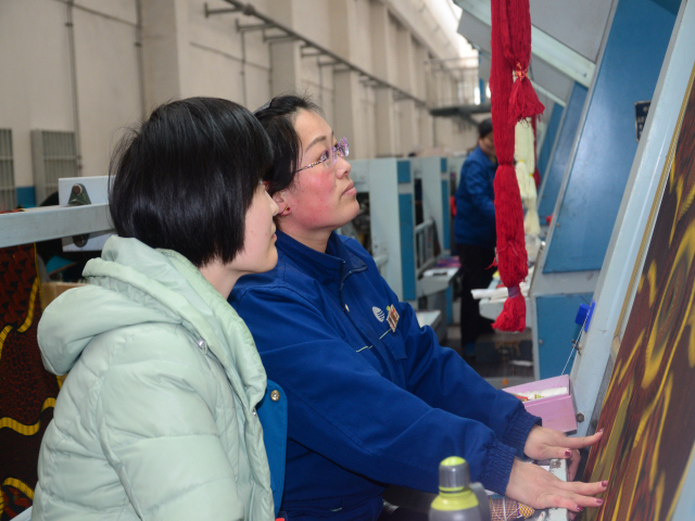 圖為袁麗霞為新員工孫紅艷傳授驗(yàn)布經(jīng)驗(yàn)。